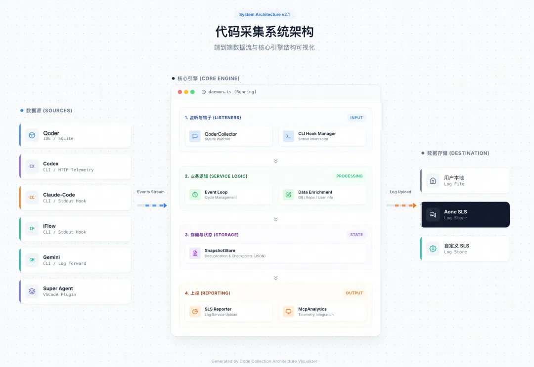 在AI编程工具快速普及的今天,如何有效采集和分析AI代码生成数据成为了一个重要课题。我们设计并实现了一套基于MCP(Model Context Protocol)架构的多AI工具代码采集方案,支持claude-code、iflow、codex等CLI工具以及qoder IDE。这套方案具有轻量化、用户无感、可扩展等特点,目前已经和Aone团队合作,数据将自动采集到Aone的日志平台用作团队AI采纳率数据加工的基础。当前已支持claude-code、codex、gemini、ykcli、iflow/iflow-aone、qwen-code、qoder等工具,平台覆盖 macOS + Windows。