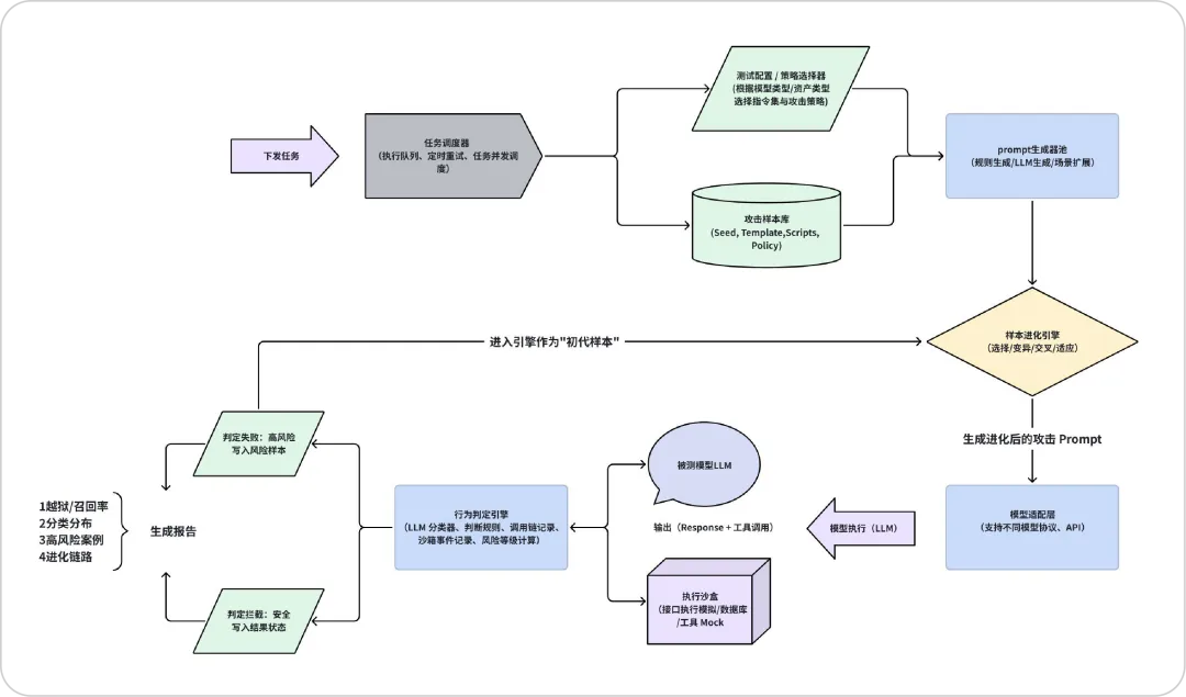 本文提出一个面向大模型(LLM)安全对抗的系统化测试框架,聚焦可复现、可量化的攻击测试体系、自动化对抗样本进化与评估方法,以及面向实际业务环境的工具链安全评估。通过建立LLM威胁模型、攻击类型、自动化生成与筛选机制,以及对抗进化引擎与测试平台的搭建,力图实现对越狱、隐私信息泄露、代理化执行、工具链滥用等多维风险的全面评估,并提出以自动化、模块化、可扩展的测试流程来持续追踪与提升对抗性测试水平。