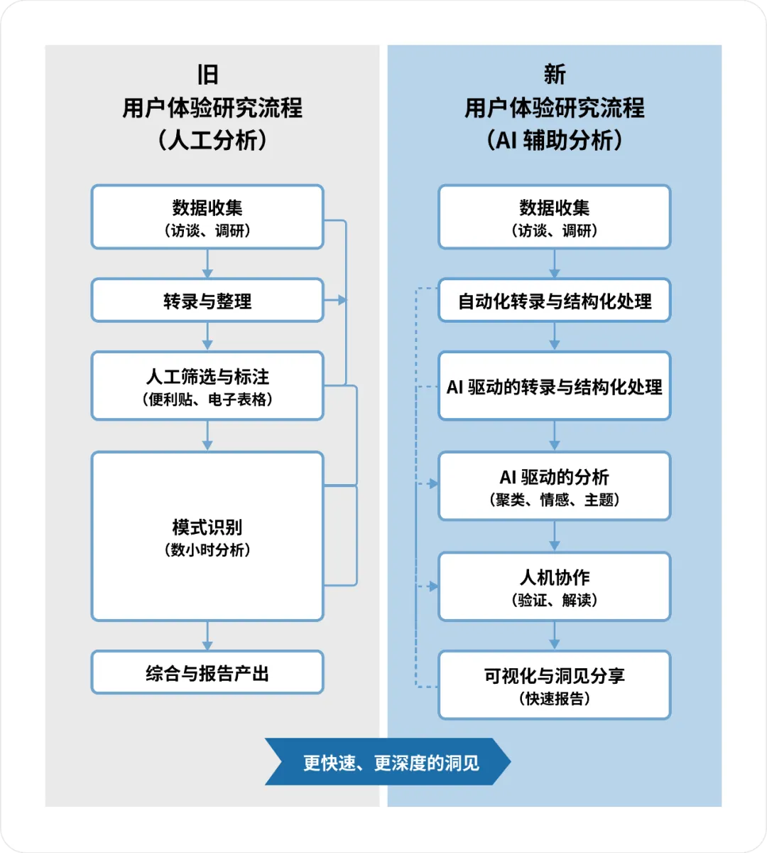AI 正在重塑用户研究与体验设计的角色与流程,通过生成式 AI 的加速分析、规模化洞察与智能化建议,帮助设计师从重复性工作解放出来,聚焦共情、叙事与策略层面的价值;同时也带来偏见、依赖和隐私等风险,未来需要以 AI 伙伴关系为导向,结合人类洞察与伦理治理,共同创造更优的用户体验。