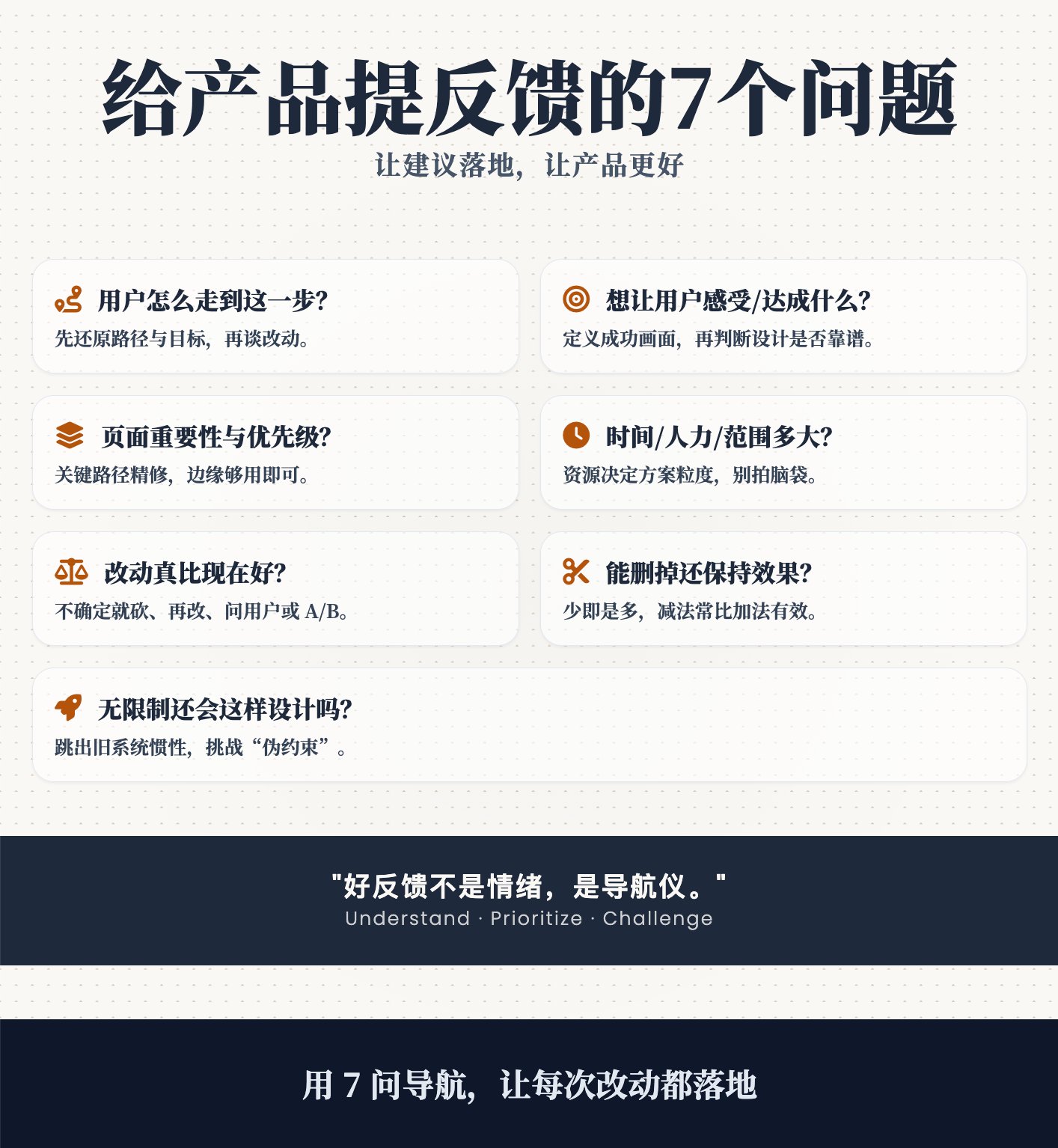 @joulee 提出的这 7 个问题很适合作为开发等向产品提出意见时参考,也很适合产品经理自己作为自省自查的 Checklist —— 站在用户角度,结合目标、优先级和资源,提出真正有用的建议。核心是理解用户、明确目标、权衡资源,还要敢于删减和挑战假设。这样反馈才能落地,帮产品变得更好。