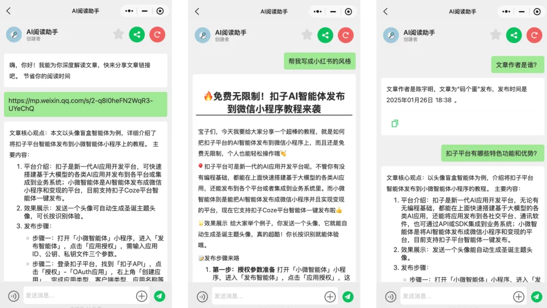 本文介绍在扣子(Coze)平台上零代码快速搭建一个AI阅读助手智能体的全过程:从需求定义、在平台内的人设与回复逻辑、技能插件(尤其是读取链接插件)的配置,到测试与发布,并详细给出将智能体发布到小程序和绑定公众号的具体步骤与注意事项,展示了通过插件组合实现对网页内容的读取、摘要与二次创作等能力的全过程,强调在整个流程中对权限令牌与发布流程的安全与合规性要点,并指出若要实现更高阶功能可扩展工作流、知识库和数据库等技能。最后鼓励读者根据自身需求探索更多智能体应用场景。